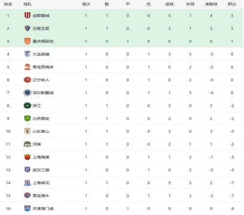 中超首輪綜述及積分榜,成都51領(lǐng)跑,泰山國安申花贏球