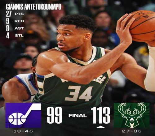 常規(guī)賽,雄鹿主場113-99戰(zhàn)勝爵士。