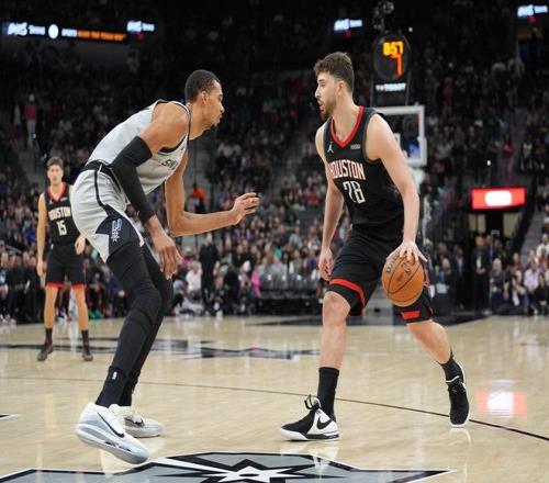 馬刺的首發(fā)陣容是文班亞馬+四射手配置,雖然卡斯?fàn)柋举惣镜娜滞渡洳⒉粶?zhǔn),但是卡斯?fàn)柌⒉皇峭耆荒芡?,火箭的首發(fā)陣容依舊是阿門(mén)+申京兩位沒(méi)籃拒投的配置,烏度卡依舊認(rèn)死理。