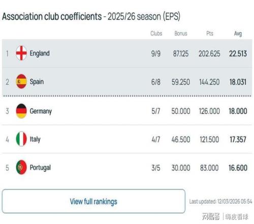 從目前的積分來看,英超雖然優(yōu)勢減少,但是領(lǐng)先幅度還是很大的,主要得益于本賽季增加了新規(guī)則。歐洲三大杯的聯(lián)賽階段,修改為按照排名來計算獎勵積分,而且權(quán)重得到大幅提高。