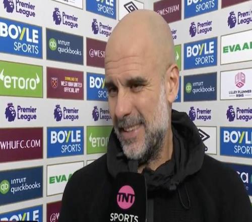 英超第30輪,曼城客場(chǎng)1-1戰(zhàn)平西漢姆聯(lián),賽后,曼城主帥瓜迪奧拉接受了TNT體育的采訪。