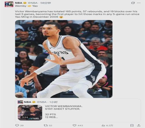 NBA官方寫道:“文班亞馬在過去的5場(chǎng)比賽一共得到165分、57個(gè)籃板和19次蓋帽,成為自2006年12月姚明以來,首位在連續(xù)5場(chǎng)比賽達(dá)成這些數(shù)據(jù)的NBA球員?!碑?dāng)時(shí)火箭隊(duì)的賽季場(chǎng)均得分只有90多分,大家可以想象姚明有多強(qiáng)。