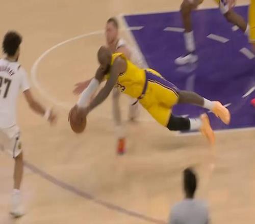 進入最后一分鐘,這場球最讓人動容的鏡頭出現(xiàn)。掘金投籃不中,一次長籃板,在底線的詹姆斯精準預(yù)判到球的落點,但他腳步速度已經(jīng)不足以讓他搶到第一落點,于是詹姆斯沒有任何猶豫,飛身魚躍把自己扔了出去,在布勞恩身前搶到了籃球。