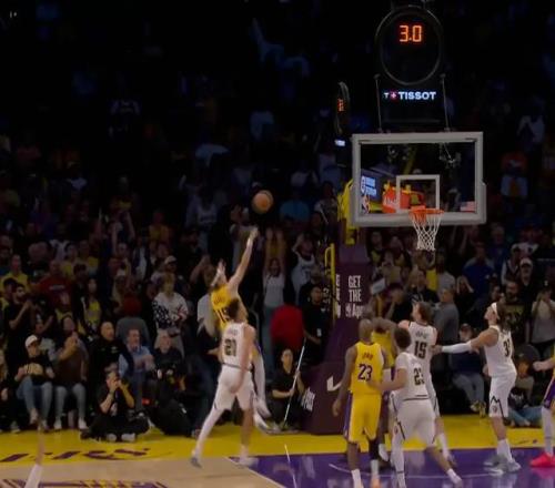 于是你能看到雖然掘金跳贏了球權(quán),但斯瑪特直接面斷了戈登,隨后反擊上籃,湖人反超1分。