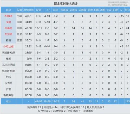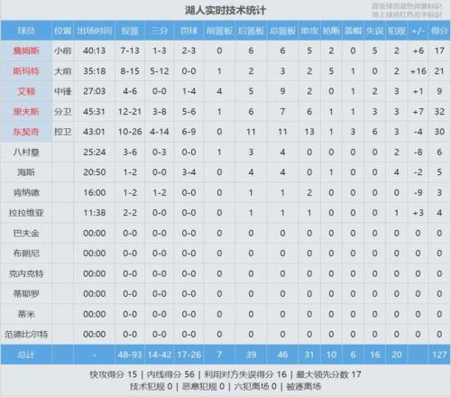 本賽季湖人和掘金交手3次,湖人2勝1負。最后看看數(shù)據(jù):
