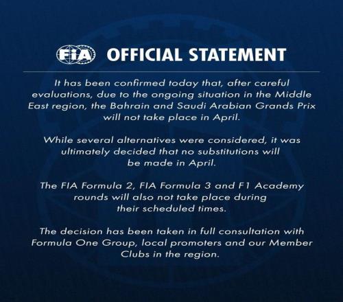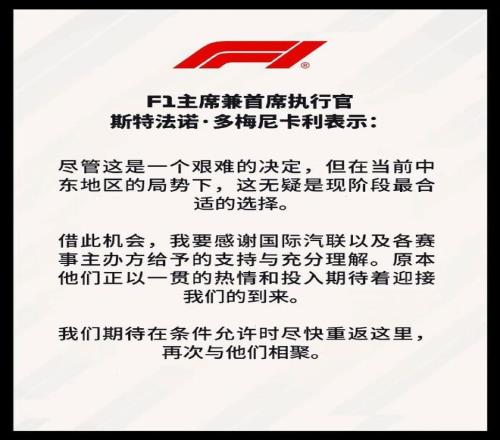 就在今天上午,F(xiàn)1官方確認了本賽季巴林和沙特阿拉伯大獎賽將不會在四月進行。官方聲明中表示,由于受中東地區(qū)當前局勢影響,原定的F1連同F(xiàn)2、F3和F1學院賽事將不會如期舉行。盡管考慮了其他備選方案,但四月將不會安排替代賽事。