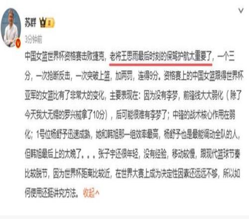 王思雨末節(jié)9分,充分展現(xiàn)了自己的能力,名嘴蘇群大夸:老將王思雨最后時刻的保駕護航太重要了。全場7投5中,還有3次助攻,再次拿到全隊最高的14分,不得不說美女王思雨是中國隊最大的功臣。上一場與南蘇丹的比賽,也是王思雨砍下全隊最高的17分,她是這次世預賽貢獻最大的隊員。