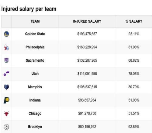 根據統(tǒng)計,勇士受傷球員的總薪水已經高達1.93億美元,占全隊薪水的93.1%,聯(lián)盟最高。他們今天派出的首發(fā)是波杰姆斯基、理查德、桑托斯、萊昂斯、波斯特,5人合計年薪不到1000萬美元!