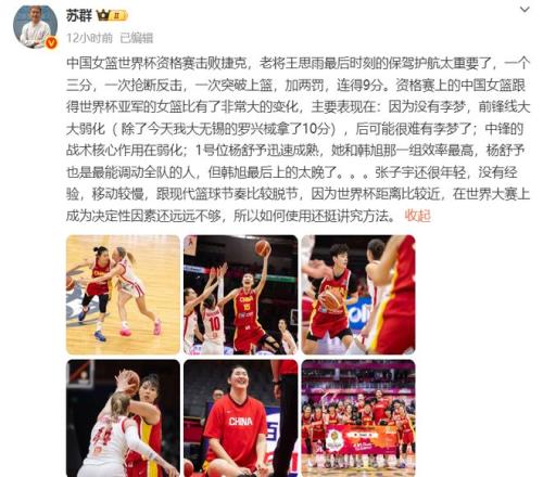 賽后,媒體人蘇群也是發(fā)文中國隊的表現(xiàn),談到張子宇時,指出:“張子宇還很年輕,沒有經(jīng)驗,移動較慢,跟現(xiàn)代籃球節(jié)奏比較脫節(jié),因為世界杯距離比較近,在世界大賽上成為決定性因素還遠遠不夠,所以如何使用還挺講究方法”。