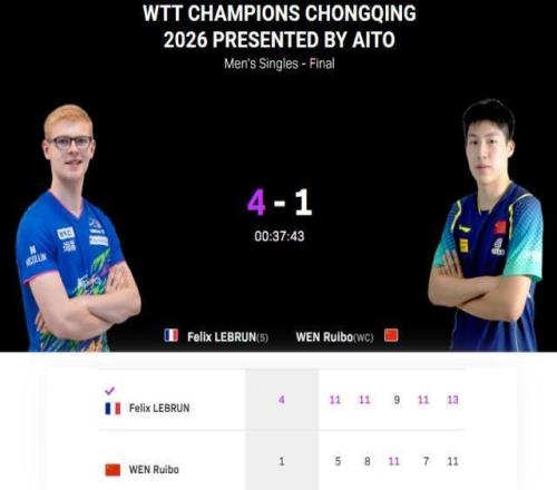 WTT冠軍賽重慶站男單決賽,世界排名第27位的19歲中國選手溫瑞博,對陣世界排名第6的法國選手小勒布倫。最終溫瑞博1比4不敵小勒布倫,獲得本站亞軍,而在女單決賽中蒯曼3比4不敵張本美和,國乒男女單均無緣冠軍。各局比分分別為:11比5、11比8、9比11、11比7、13比11(小勒布倫在前)WTT冠軍賽重慶站比賽,19歲的溫瑞博持外卡出戰(zhàn),接連淘汰莫雷加德、邱黨和張本智和闖入決賽,其中4比2淘汰張本智和的半決賽中,溫瑞博最后一局挽救5個局點,在最后時刻18比19落后的情況下,連拿3分殺死比賽。