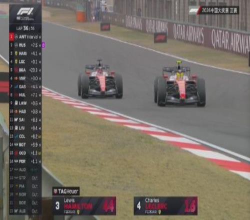第25圈,兩輛法拉利位置互換,勒克萊爾在14號(hào)彎超越漢密爾頓來(lái)到第2,漢密爾頓隨后在26圈1號(hào)彎想要從外線超越結(jié)果被隊(duì)友擋住!