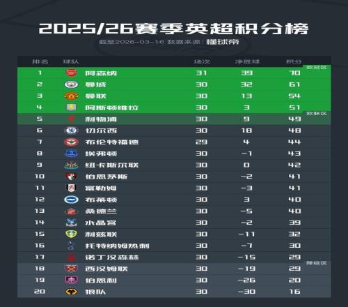 英超前30輪過后,阿森納在多賽一場(chǎng)的情況下領(lǐng)先曼城多達(dá)9分排名榜首。在五支爭(zhēng)奪歐冠資格的球隊(duì)中,擊敗維拉的曼聯(lián)則積54分排名第三,維拉51分第四,利物浦49分第5,切爾西48分第6,本輪尚未進(jìn)行比賽的布倫特福德則積44分排名第7。