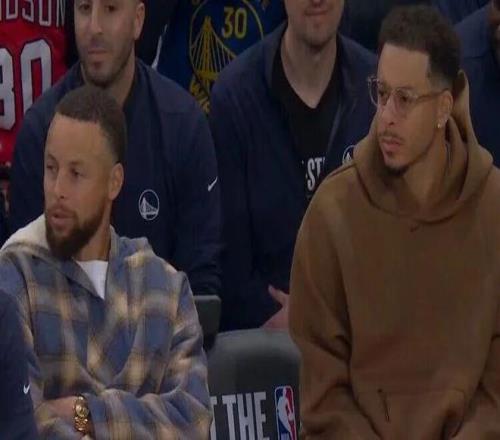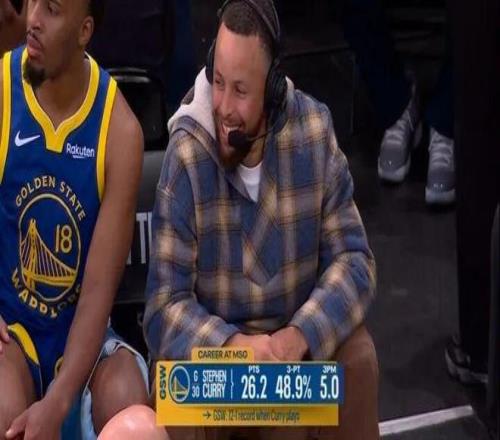 替補(bǔ)席客串解說(shuō)的庫(kù)里眉飛色舞,開(kāi)心得不行
