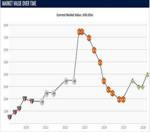 這位巴西邊鋒的巔峰身價(jià)是2022年9月的7500萬歐元,那年夏窗,他以9500萬歐元的轉(zhuǎn)會(huì)費(fèi)從阿賈克斯轉(zhuǎn)會(huì)曼聯(lián),不過自那之后,由于表現(xiàn)不佳,他的身價(jià)一直在下跌,在曼聯(lián)時(shí)曾跌到了2000萬歐