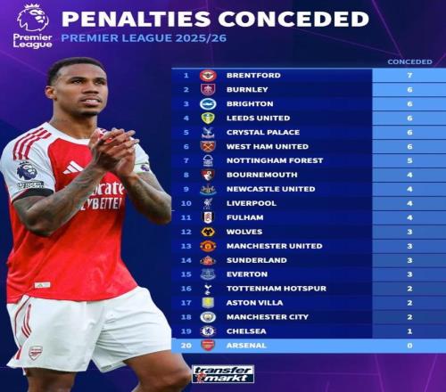 本賽季英超點(diǎn)球丟球榜:布倫特福德7球第1,阿森納0球