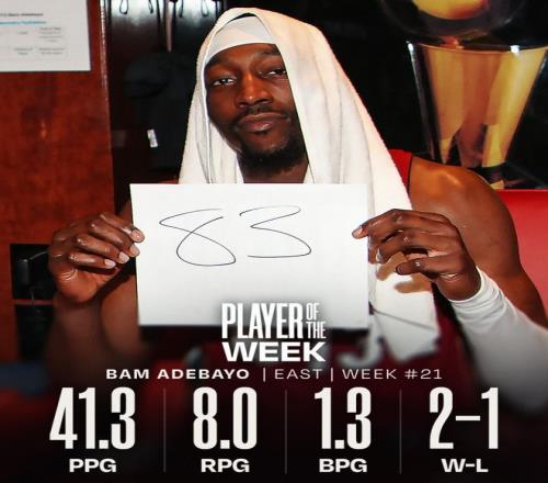 熱火內線阿德巴約當選東部周最佳球員。這是他本賽季第2次、職業(yè)生涯第4次獲此獎項。