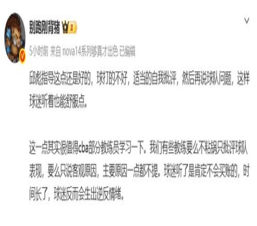 對(duì)于邱彪的賽后發(fā)言,廣東媒體人“別跑剛背豬”發(fā)文認(rèn)為:邱彪指導(dǎo)這點(diǎn)還是好的,球打的不好,適當(dāng)?shù)淖晕遗u(píng),然后再說(shuō)球隊(duì)問(wèn)題,這樣球迷聽(tīng)著也能舒服點(diǎn)。這一點(diǎn)其實(shí)很值得cba部分教練員學(xué)習(xí)一下。我們有些教練要么不粘鍋只批評(píng)球隊(duì)表現(xiàn),要么只說(shuō)客觀(guān)原因,主要原因一點(diǎn)都不提。球迷聽(tīng)了是肯定不會(huì)買(mǎi)賬的,時(shí)間長(zhǎng)了,球迷反而會(huì)生出逆反情緒。