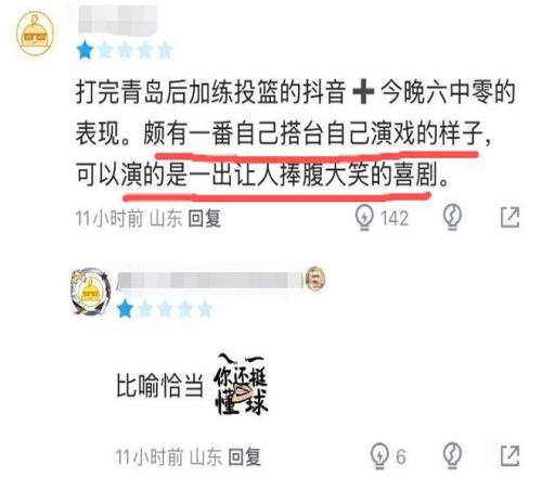 他自作自受的糟糕表現(xiàn),也引起了球迷的熱議:“繼續(xù)玩梗啊,作為隊(duì)長(zhǎng),賽前如此傲慢的態(tài)度不輸球才怪,丟人現(xiàn)眼”、“加練投籃的抖音+6中0的表現(xiàn),頗有一番自己搭臺(tái)自己演戲的樣子,可惜演的是一出讓人捧腹大笑的喜劇”。