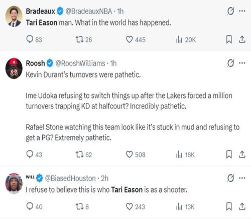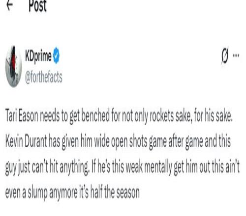 塔里-伊森在對陣湖人的比賽中再度淪為臥底一般的角色,全場比賽33分鐘,11中2,三分3中0,拿到5分9籃板3助攻2搶斷2失誤,命中率18.2%,真實命中率21%,正負值-6。他作為賽季初期火箭最準的三分投手近期的表現(xiàn)陡崖式下滑。