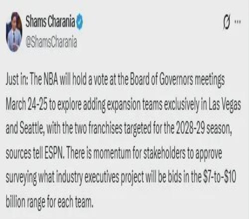 爆料王Shams:NBA將于3月24日至25日召開董事會(huì)會(huì)議,就在拉斯維加斯和西雅圖兩地新增兩支球隊(duì)的議題進(jìn)行投票表決。
