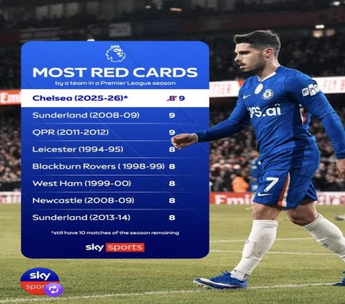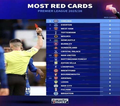 最近天空體育統(tǒng)計了英超單賽季球隊紅牌紀錄,切爾西這一季已經(jīng)被推到了最前面。內托對阿森納被罰下之后,切爾西的單賽季紅牌數(shù)已經(jīng)追平英超歷史最高紀錄,而且賽季還沒結束,后面還有比賽要踢。再把本賽季英超紅牌榜放在一起看,切爾西也是明顯高出一檔。紅牌能多到這個地步,已經(jīng)不只是紀律差這么簡單,背后到底是比賽習慣出了問題,還是這支隊在關鍵時刻總會自己把局面踢亂?(數(shù)據(jù)截至2026年3月3日)