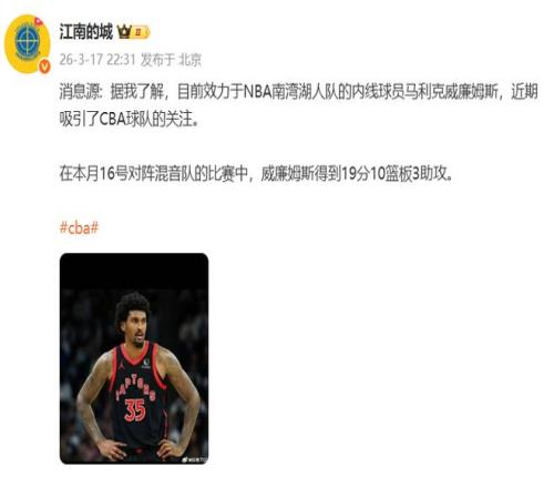 在廣東和新疆的比賽結(jié)束后,和外援經(jīng)紀公司有合作的媒體人“江南的城”爆出了一條猛料:目前效力于NBA南灣湖人隊的內(nèi)線球員馬利克威廉姆斯,近期吸引了CBA球隊的關(guān)注。