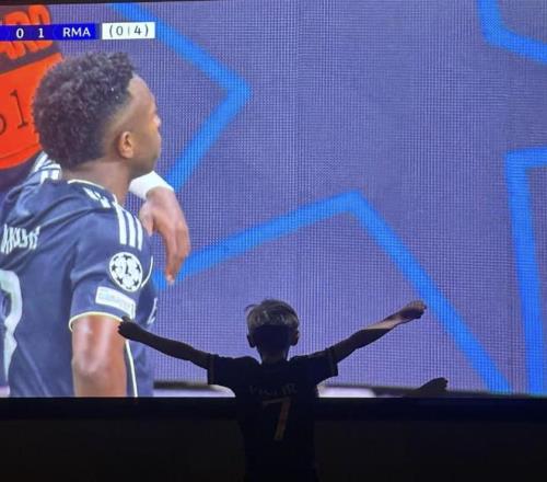 皇馬名宿加雷斯-貝爾也是帶著兒子守在電視機(jī)前一同觀賽,并在社交媒體曬出了自己兒子身穿維尼修斯球衣慶祝其進(jìn)球的照片。