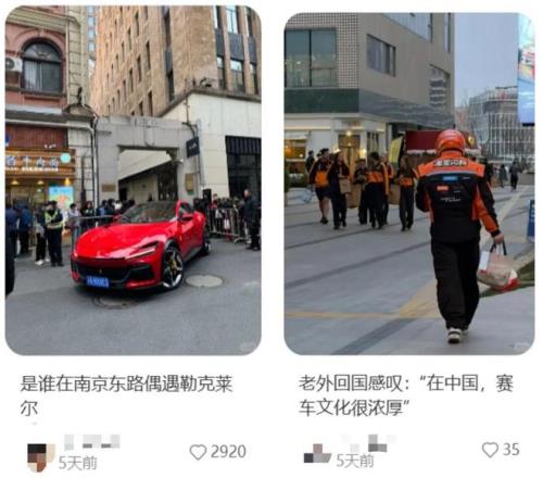 賽場(chǎng)之外,F(xiàn)1的影響力也漫溢在上海。F1車隊(duì)工作人員在開(kāi)市客采購(gòu)的畫(huà)面被超市員工拍下來(lái),作為“開(kāi)市客大牌有保障”的佐證;法拉利車手勒克萊爾和妻子逛豫園時(shí)被上海大爺攔下擺pose;淘寶閃購(gòu)?fù)赓u員和邁凱倫車隊(duì)的工作人員穿著同款橙黑外套在街頭迎面相遇,“外國(guó)人回去感慨中國(guó)賽車文化氛圍十分濃厚”;在餐廳吃飯、逛優(yōu)衣庫(kù),都能偶遇一兩個(gè)賽車手。