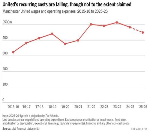 將工資單和其他運(yùn)營(yíng)支出合計(jì),曼聯(lián)在2022-23賽季花費(fèi)了4.95億英鎊,在拉特克利夫到來(lái)的2023-24賽季花費(fèi)了5.14億英鎊。上賽季,這些綜合成本降至4.84億英鎊,而根據(jù)曼聯(lián)截至12月底的業(yè)績(jī)并采用一些樂(lè)觀的模型推算,本賽季可能降至約4.5億英鎊。這些都是顯著的削減,但與每年節(jié)省1.25億英鎊的目標(biāo)還相差甚遠(yuǎn)。