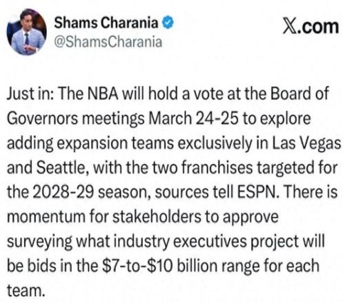 來自Shams Charania的最新爆料,NBA計劃在下個月的理事會會議上,正式討論擴(kuò)軍事宜;而候選城市也很直接,分別是拉斯維加斯和西雅圖。