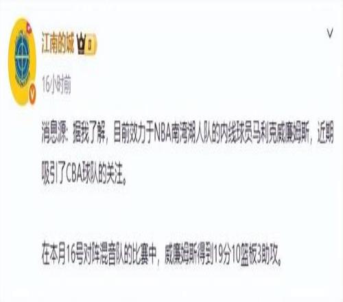 其實(shí)在之前的窗口期里,廣東男籃也一直在尋找新的大外援人選,而朱芳雨在球迷群里的一句“新外援在路上”,更是讓廣東球迷充滿期待,但隨后卻沒有了相關(guān)消息。就在日前,媒體人“江南的城”透露,在NBA發(fā)展聯(lián)盟征戰(zhàn)的大外援馬利克-威廉姆斯,引起了CBA球隊(duì)的關(guān)注。