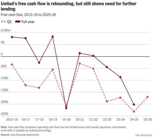 首先,拉特克利夫注入了2.385億英鎊,這筆錢,除了卡靈頓訓練基地的工程之外,幾乎都花在了轉(zhuǎn)會費和運營成本上。此后,曼聯(lián)借貸愈發(fā)頻繁。再加上其他方面的削減,使得在不到兩年的時間里,轉(zhuǎn)會總支出超過5億英鎊。曼聯(lián)從未瀕臨破產(chǎn),但一個有趣的假設(shè)是,如果沒有人出現(xiàn)并注入拉特克利夫投入的那些資金,會發(fā)生什么。