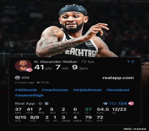 更令人驚嘆的是,這支老鷹如今以37勝31負(fù)的戰(zhàn)績(jī)翱翔于東部第八,與第六的猛龍僅相差1.5個(gè)勝場(chǎng),季后賽直通車的已觸手可及!而真正讓球迷沸騰的,是那位從雷霆體系走出的"亞歷"新星——亞歷山大-沃克,這位身高1米96、臂展2米07的鋒衛(wèi)搖擺人,正用一場(chǎng)場(chǎng)史詩(shī)級(jí)表演書寫著屬于自己的逆襲篇章。