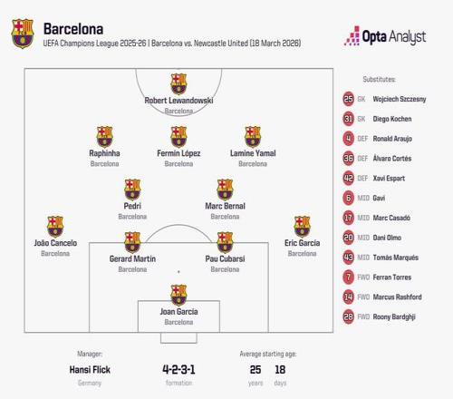 歐冠1/8決賽次回合,巴塞羅那主場對陣紐卡斯?fàn)柭?lián),此役巴薩首發(fā)平均年齡為25歲18天,這是巴薩隊(duì)史歐冠淘汰賽最年輕的首發(fā)陣容。