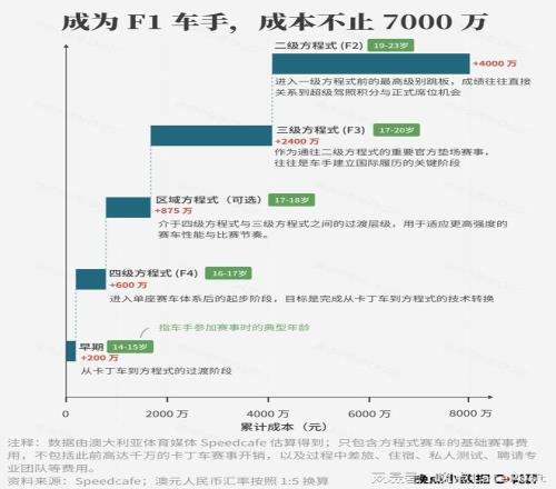 你很難再找到一項(xiàng)全球巡回賽事,全年只有 22 名正式選手能參賽。成為 1/22,需要 7 歲開(kāi)始練習(xí)卡丁車(chē),15 歲進(jìn)入最低級(jí)別的 F4 賽事,再到 F3、F2,直至被 F1 車(chē)隊(duì)選中。在進(jìn)入 F1 之前的階段,他光參賽就至少需要 7000 萬(wàn)元,還不包括中間的培訓(xùn)、差旅費(fèi)用。而表現(xiàn)不好,一年合約到期就會(huì)失去席位,很難回到賽場(chǎng)。