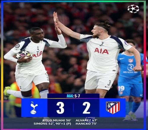 第30分鐘穆阿尼的進球幫助熱刺取得領(lǐng)先。馬競在第47分鐘由阿爾瓦雷斯勁射扳平比分。第52分鐘哈維-西蒙斯的進球,讓熱刺再度取得領(lǐng)先。第75分鐘漢茨科接角球頭球破門再次追平。第89分鐘西蒙斯點射梅開二度,熱刺3-2贏下本場比賽,但是由于首回合大比分失利,熱刺最終5-7遭到了馬競淘汰。