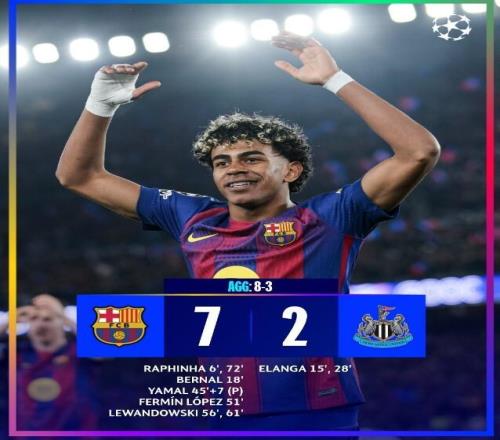 上半場(chǎng)比賽拉菲尼亞和貝爾納爾兩次幫助巴薩取得領(lǐng)先,伊蘭加兩次幫助紐卡扳平。半場(chǎng)補(bǔ)時(shí)亞馬爾點(diǎn)射命中,巴薩3-2取得領(lǐng)先。下半場(chǎng)巴塞羅那火力全開,費(fèi)爾明破門,萊萬梅開二度,拉菲尼亞錦上添花,最終7-2贏下勝利,兩回合8-3將對(duì)手淘汰出局。