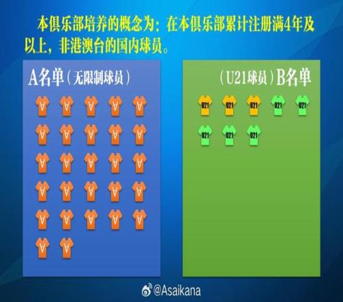剩余名額須為本俱樂部培養(yǎng)的U21球員(指在國內(nèi)球員中,非港澳臺身份,且在本俱樂部累計注冊滿4年或以上)。