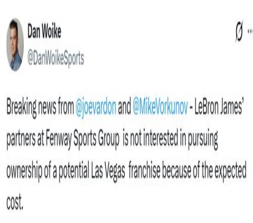 據(jù)兩位直接了解芬威意圖的消息源向The Athletic透露,詹姆斯自2011年起的商業(yè)伙伴、同時擁有波士頓紅襪與英超利物浦的芬威體育集團,目前無意競標拉斯維加斯的擴軍隊。其中一位未獲授權公開表態(tài)的消息源稱,這家全球體育投資公司退出,是因為預期成本過高——據(jù)報道,聯(lián)盟對每支擴軍球隊收取的加盟費最高可達80億美元。