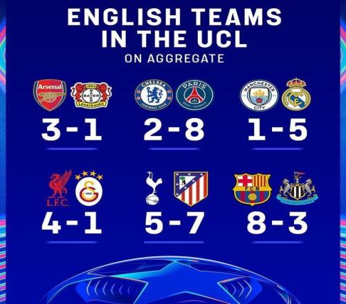 本賽季歐冠1/8決賽已全部結(jié)束,英超6隊(duì)僅剩阿森納和利物浦順利晉級(jí)。