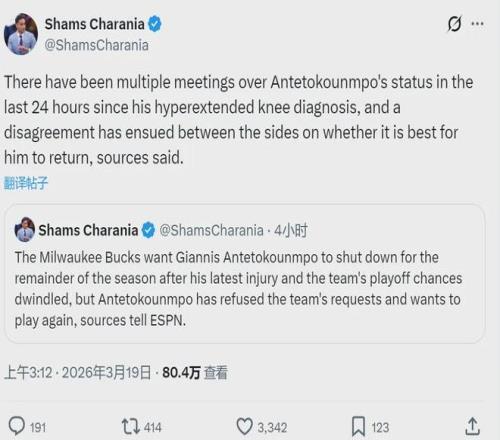 隨后Shams在節(jié)目中表示:“字母哥遭遇左膝過(guò)度伸展和骨挫傷,一周后接受復(fù)查。這是他本賽季的第五次受傷,管理層希望他不要再打了。字母哥向雄鹿總經(jīng)理霍斯特及工作人員明確表示,他不會(huì)選擇賽季報(bào)銷,本賽季一定要復(fù)出?!?/p>