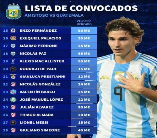 北京時(shí)間3月19日,在阿根廷國家隊(duì)公布新一期大名單之后,德轉(zhuǎn)也列出了阿根廷隊(duì)此次28人大名單的身價(jià)排行榜,胡利安-阿爾瓦雷斯和恩佐-費(fèi)爾南德斯同以9000萬歐元并列第一,麥卡利斯特8000萬歐元第三,梅西1500萬歐元。