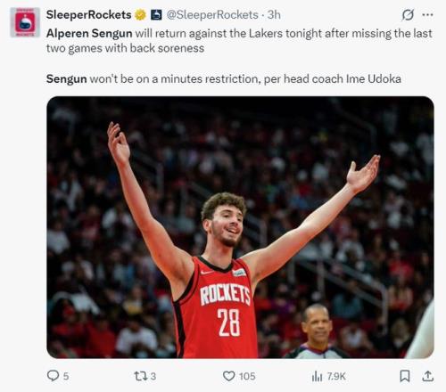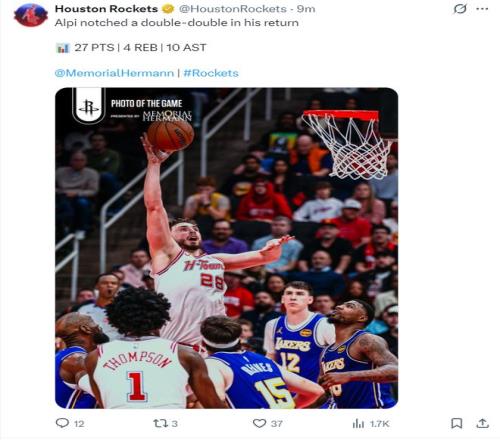 火箭官方寫道:申京在復(fù)出后拿到了兩雙數(shù)據(jù)。