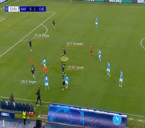 還有一月切爾西3-2戰(zhàn)勝那不勒斯比賽中主隊的首粒進球。丟球時,凱塞多被落在球前,但費爾南德斯位置正好可以封堵安東尼奧-韋爾加拉。然而他卻后退了一步,大概是擔心可能的傳球,讓韋爾加拉帶球直面韋斯利-福法納。凱塞多奮不顧身的鏟球未能救險,福法納被過,結果是進球:
