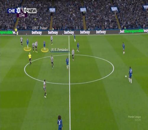 但在其他場合——最常見的是當切爾西面對低位防守時——他們在場上的關系會變得更加混亂,因為他們尋求占據(jù)相同的空間。紐卡最近在斯坦福橋1-0獲勝就是很好的例子: