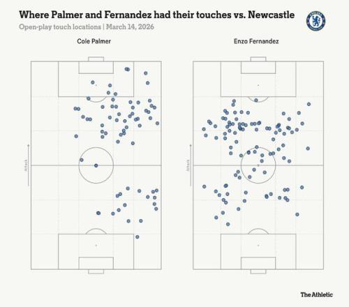 在2025-26賽季,他沒有英格蘭球員出場的21場比賽,與兩人共同出場的24場相比,他在對方禁區(qū)內觸球次數(shù)幾乎翻倍,傳入進攻三區(qū)的次數(shù)翻倍。他每90分鐘創(chuàng)造機會的平均值從1.6次增加到2.3次。他的射門次數(shù)也更多(預期進球值顯著更高),射正次數(shù)翻倍,并且進球轉化率更高。點球對此有貢獻,因為帕爾默缺席時費爾南德斯是主罰者。