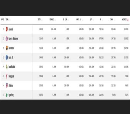 西甲三強(qiáng)歐冠全晉級(jí),但數(shù)據(jù)預(yù)測(cè)阿森納才是最大熱門(mén)