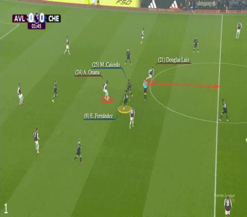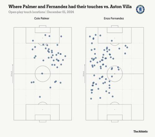 在那場對陣維拉的比賽中,他們各自影響力范圍有著自然的平衡,帕爾默主要在球場右側(cè)觸球,費爾南德斯在左側(cè):
