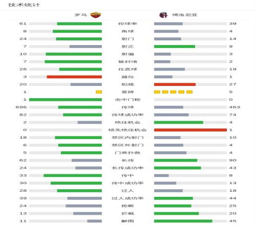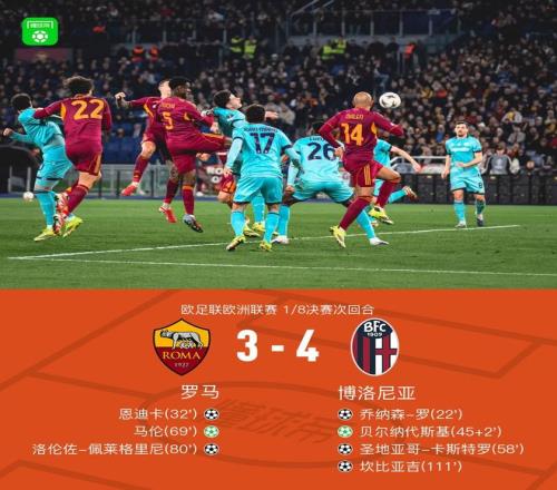 北京時間3月20日歐足聯(lián)歐洲聯(lián)賽 1/8決賽次回合,羅馬對陣博洛尼亞。上半場羅首開記錄,隨后恩迪卡破門扳平,貝爾納代斯基點(diǎn)射破門領(lǐng)先,下半場卡斯特羅破門擴(kuò)大比分,馬倫點(diǎn)射破門佩萊格里尼破門扳平比分。加時賽坎比亞吉破門制勝。最終比分羅馬 3-4 博洛尼亞。兩回合總比分羅馬4-5博洛尼亞。