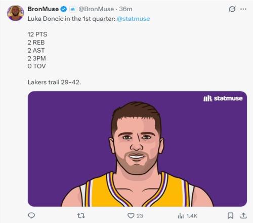 第三節(jié)開場僅僅5分鐘,東契奇5中4,三分4中3連取11分1籃板2搶斷幫助湖人完成反超。東契奇又現(xiàn)驚魂一幕,阿德巴約直接騎到了東契奇的背上,東子的腰部明顯不適但他沒有申請下場,三節(jié)打完東契奇24中13,三分14中7,拿到40分6籃板3助攻4搶斷,單節(jié)拿到19分。